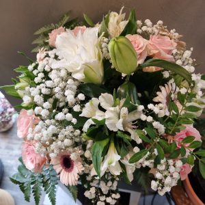 Ramo de flores blancas, rosas y fucsias con hojas verdes.